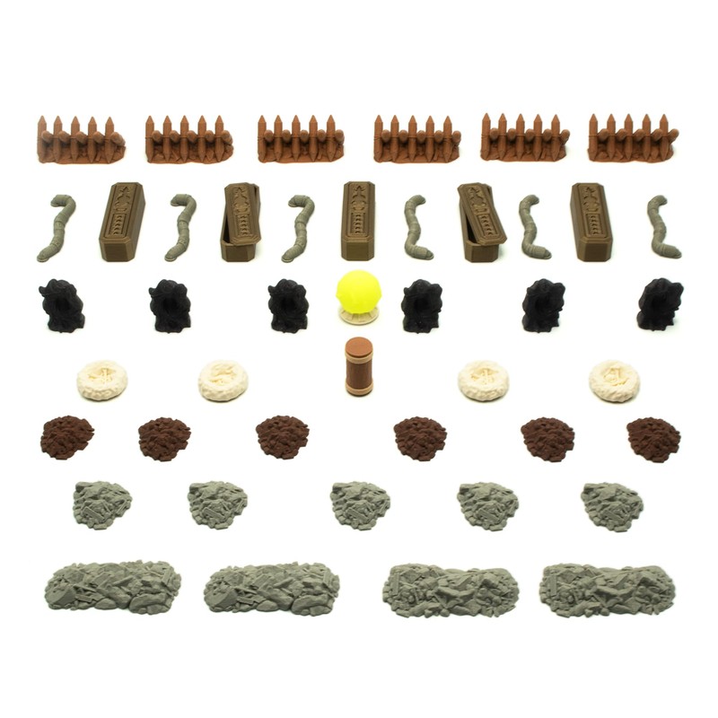 - 44-teiliges Set: 6 Barrikaden, 6 Dunkler Nebel-Token, 6 Energieleitungen, 6 Trümmer-Token, 5 Ruinen-Token (1-Hex), 4 Ruinen-Token (2-Hex), 4 Nester, 3 offene Sarkophage, 2 geschlossene Sarkophage, 1 leuchtende Kugel und 1 Holzmast/-mast