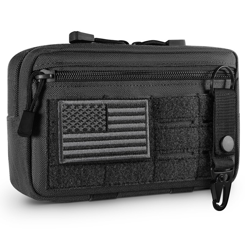 - LASER-CUT LOOP PALS/MOLLE PANEL: Tactical admin pouch front coverd in 9" by 3" laser-cut Molle/PALS loop panel. Easy to attach extra supplies or Molle gears as need to enlarge the carrying capacity. The free US flag patch & tactical keychain makes the utility pouch more conspicuous and practical. Admin pouch size: 8.7" x 5.3" x 2.2" (22.1cm*13.5cm*5.6cm).