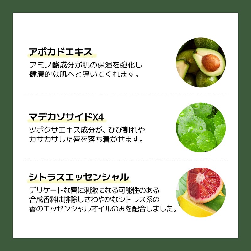 - Artificial fragrance FREE - Artificial fragraces that can irriate fragile lips are excluded, and essential oils with a refreshing citrus scent are included.