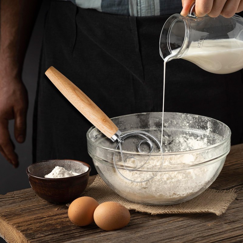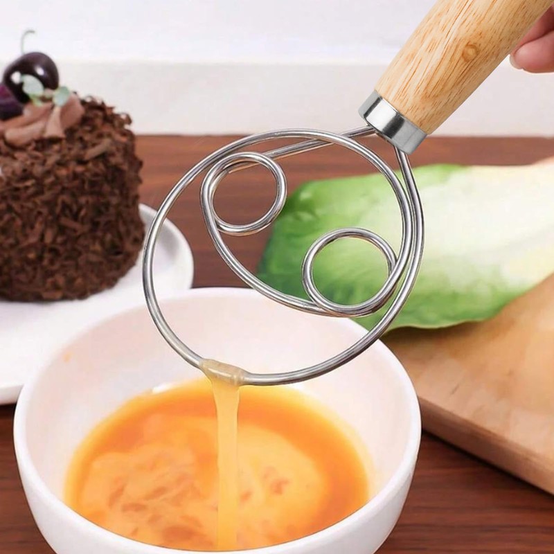 FRUHLING Dänischer Teig Schneebesen Eierschläger Holzgriff Mixer Teigbesen Teigmischer Edelstahl Brotmixer für Backen Brot Gebäck Dessert Pizzateig