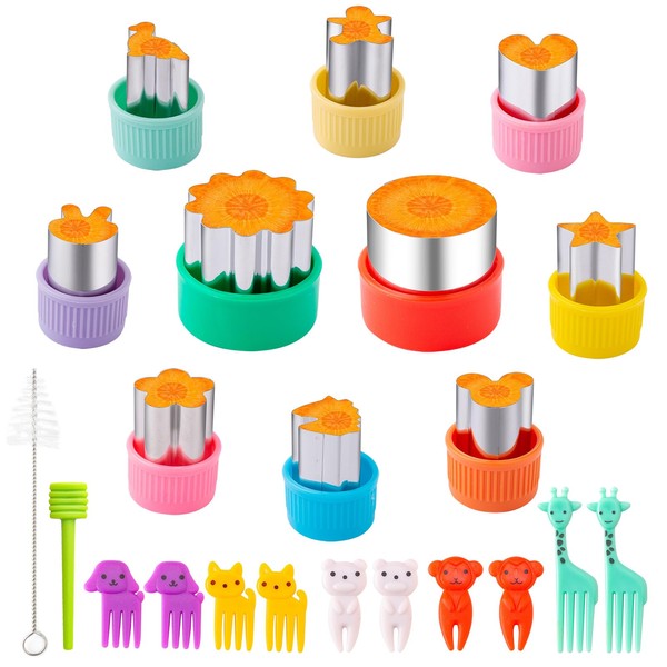- đăFruit & Vegetable Cutters 22 PcsăShapes includes: 2 large vegetable cutters (flower, round shapes), 8 small fruit cutters (dinosaur, mickey mouse, rabbit, heart, unicorn, gingerbread man, star, small flowers shapes), 10 animal fruit fork, 1 Stick, 1 cleaning brush.