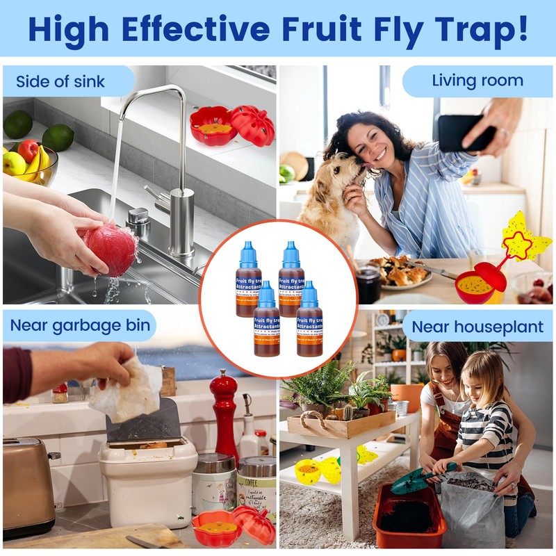 - Affordable Fruit Fly Trap Bait Refill:This fruit fly trap has 4 liquids in a pack for longer protection.You can also use any container with liquid so you can save money!We are determined to provide you with the best possible service.