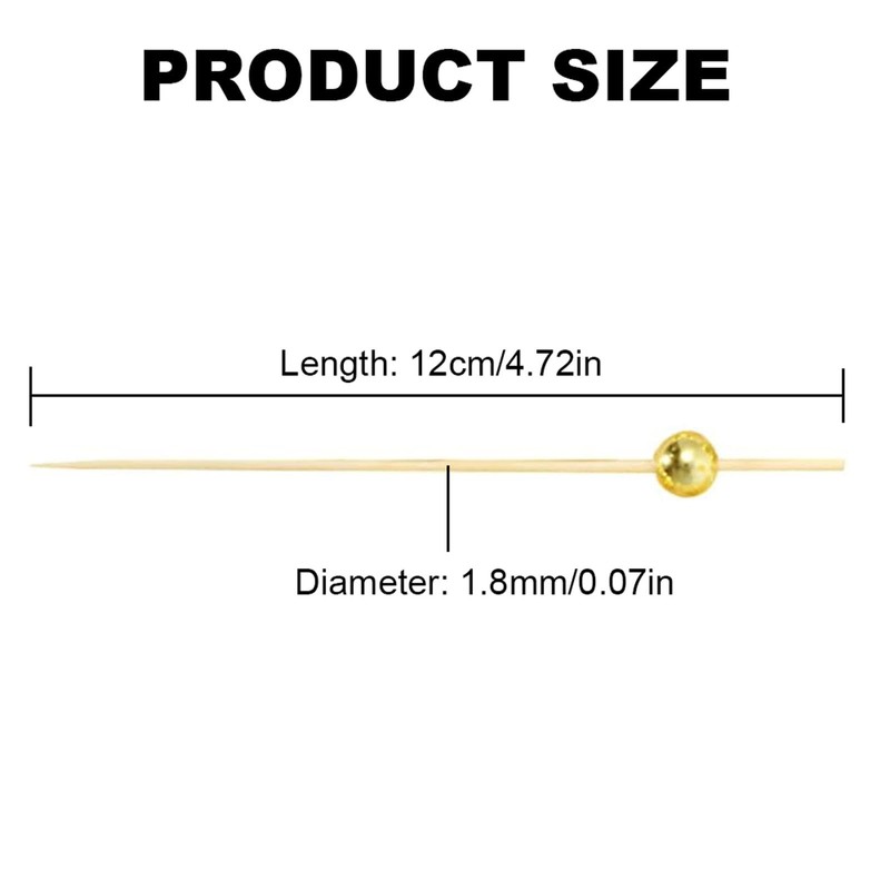 - Comfortable Grip: Wooden toothpicks are finely processed, smooth and delicate surface, no sharp burrs, to ensure the safety and comfort of use. It measures 12cm/4.72in in length and 1.8mm/0.07in in diameter. The right size together with the golden bead on the end allows you to grip the cocktail pick easil