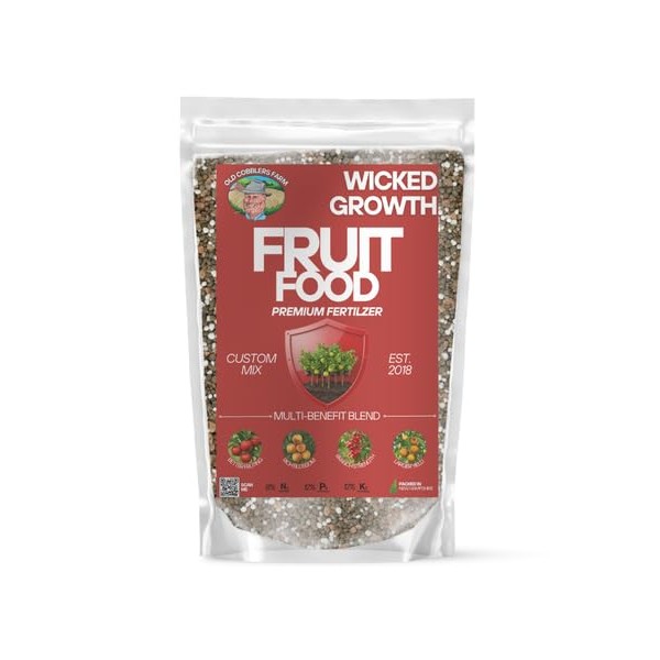 Fruit Tree Food by Old Cobblers Farm is a premium, all-purpose fertilizer specially formulated to support the unique needs of fruit-bearing trees throughout every stage of growth. With a balanced 10-10-10 NPK ratio, this complete nutrition blend helps build strong roots, support leafy canopy growth, and fuel consistent flowering and fruit production across a wide variety of tree types. The 10% nitrogen promotes steady vegetative growth, encouraging healthy leaves and robust branch structure—vital for supporting heavy fruit loads. Phosphorus at 10% strengthens root systems and enhances flowering potential, while potassium at 10% improves fruit quality, increases disease resistance, and helps trees withstand stress from weather, drought, or pruning. Perfect for apple, pear, peach, cherry, citrus, plum, fig, and other backyard orchard trees, this fertilizer ensures dependable results whether you're planting young saplings or maintaining mature producers. Use during early spring growth, pre-bloom, and mid-season to provide long-lasting nourishment and help trees set larger, more flavorful fruits with every cycle. This easy-to-apply granular formula can be used around the dripline of each tree or incorporated into the soil during planting or seasonal feedings. Designed for home growers and hobby orchards, Fruit Tree Food delivers professional-grade results in every scoop—helping your trees grow stronger, fruit fuller, and produce reliably year after year.