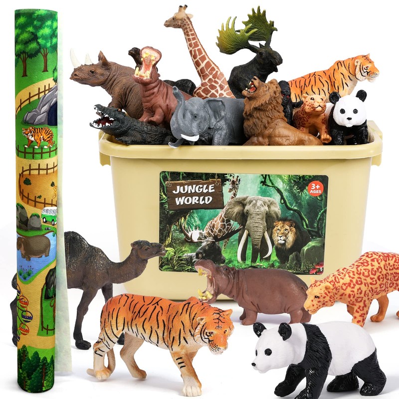 - 【Safari Animals World】This interactive wild animal toys playset includes Pandas,Lions,Elephants,Tigers,Giraffes,Gorilla,Crocodiles,Hippos,Cheetahs,Rhinos,Camels,Elk and a large activity playmat.Let the zoo animals themed mat and the safari animals turn your space into a primitive playroom,and the kids start their wildlife adventurous journey!