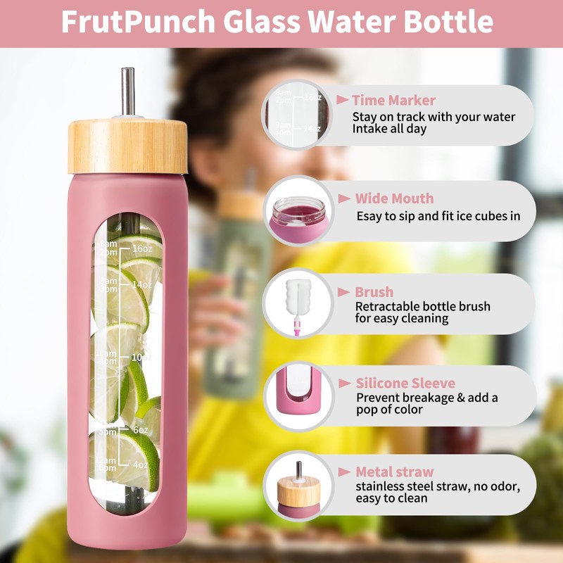 FrutPunch 18 OZ Glass Water Bottles, Water Bottle with Time Marker, Leakproof Glass Water Bottles with Silicone Sleeves, Suitable for Offices and Gyms. (pink)