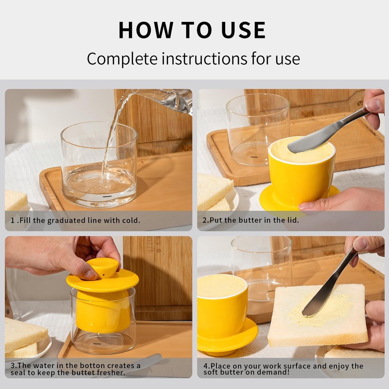 • How to use:Butter crock is simple to use. Just pour the softened butter into the lid and add water to the specified water level. The water in the Butter crock can be replaced every 2 days, which seals and protects and preserves the delicate flavor and freshness of the butter, and is dishwasher-safe.