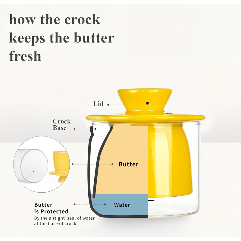 • Newest design:Butter Crock adopts a two-piece design, an inverted bell-shaped lid and a jar base. When cold water is added to the container, an airtight water seal is formed inside the container, which keeps the butter fresh without refrigeration, without spoiling or developing odors, keeping the butter fresh and spreadable for days.