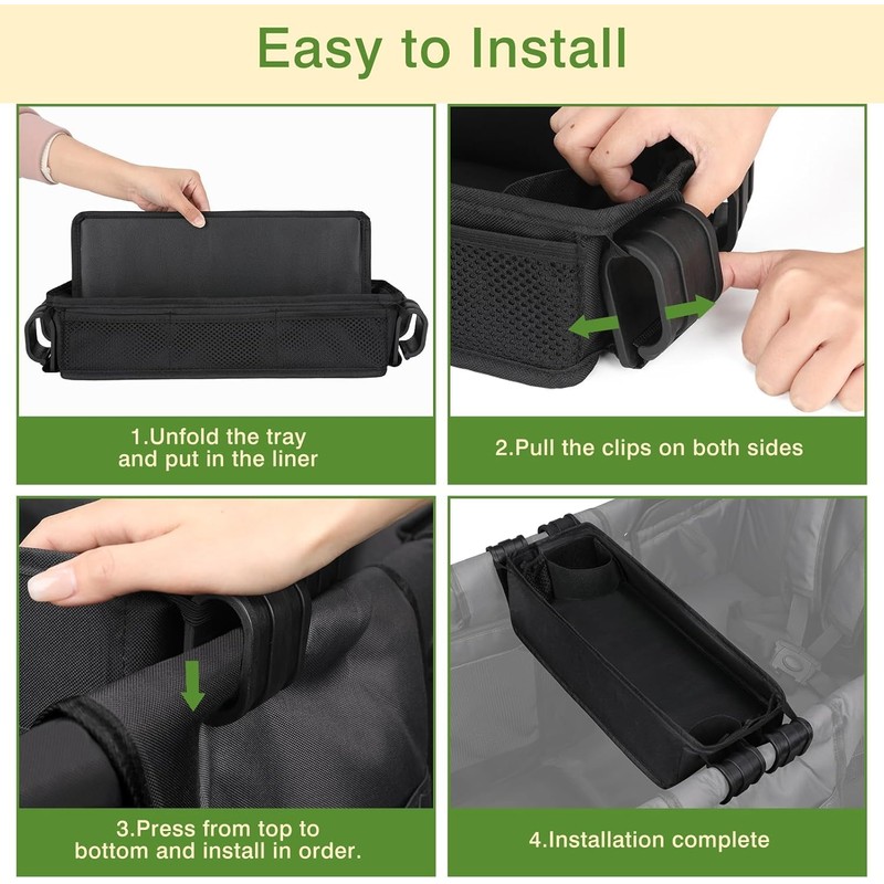 - Easy to install the four clips make attaching the universal stroller accessories snacks tray simple and quick are very sturdy