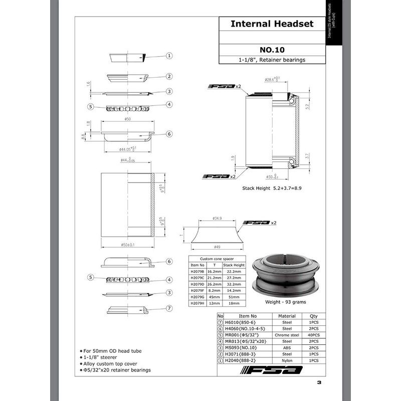 FSA No.10 Semi Integrated/Internal Headset - 1-1/8" 16.2mm Top Cone ZS44#XTE1635