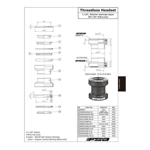 FSA NO.2N Orbit UF 1-1/8 Threadless Sealed Bearing Headset, Black, XTE1714