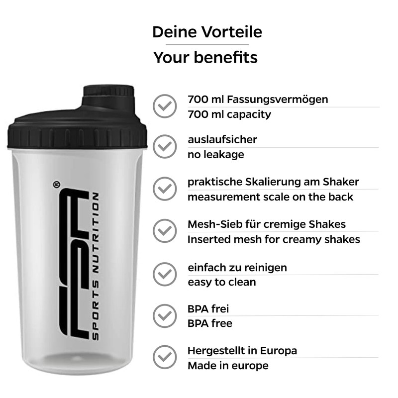 - ✔ The capacity of the shaker is a proud 700 ml. The high-quality shaker is made in Europe, dishwasher safe, 100% tasteless, free from BPA (Bisphenol A) and harmful plasticisers