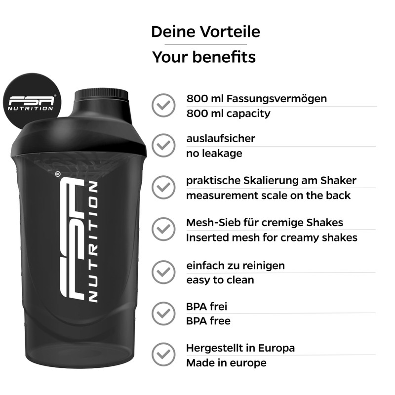 FSA Nutrition Protein Shaker 800 ml - with Strainer for Creamy Lump-free Shakes - BPA Free - Protein Shaker - Leak-Proof - with Scale - Black