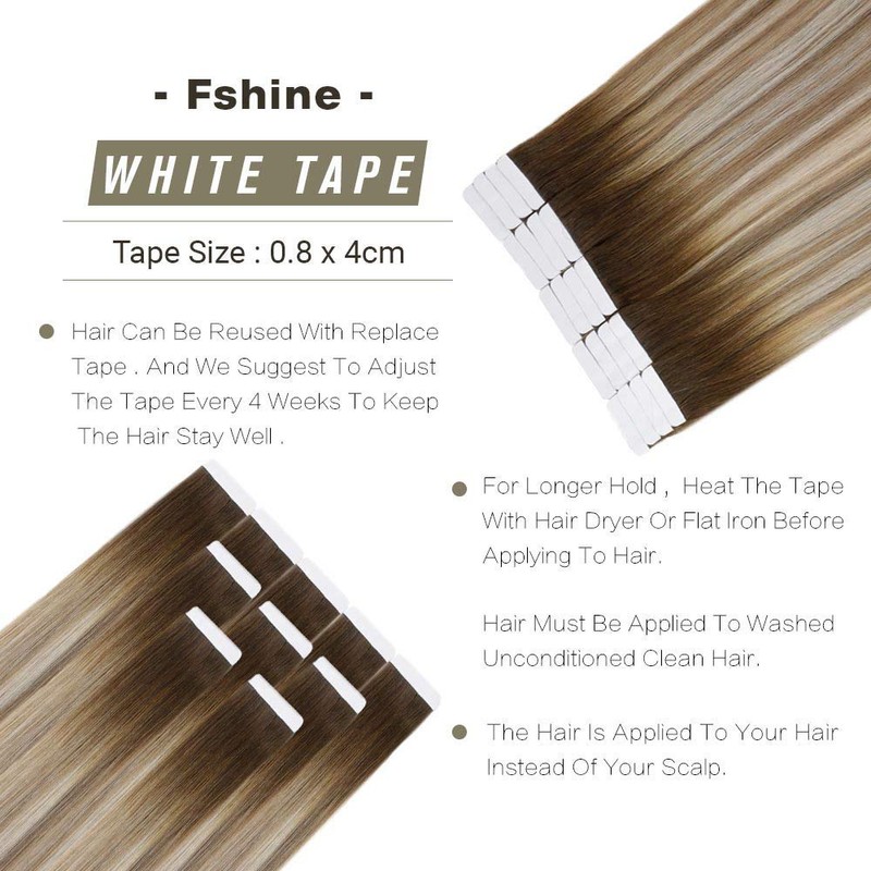 Fshine Hair is Dedicated to the Development of the Premium Quality Tape Hair Extensions. It was Developed and Tested over 10 Years. Our Goal was to Achieve the Most Secure Application to the Hair Whilst Being Easy to Remove Upon Removal and Reapplication. Our Tape Extensions Blend Well with Your Own Hair, Multiple Balayage Colors Keep Updating to Echo More and More Clients’ Requires. Fshine Tape In Hair Extensions Human Hair Could be Washed, Styled Just Like Your Own Hair. **Product Details** Hair Material: Remy Hair Texture: Straight, and Have a Natural Wave When Wet or Left to Air-dry or Diffused Tape: White Tape Tape size: 0.8cm * 4cm Weight: 2.5g/pcs Quantity: 20 Pcs/Pack **Notice Before Order** Fshine Hair Extension is Not Double Drawn, It is Normal to Have Short Hair Mixed About Quantity: 40-80 Pieces are Recommended for Full Head About Color: Could Dyed But not Lightened. Always Test a Tress Before Dye The Whole Part About Wash: Everyday Wash is Not Good for Your Extensions. Wash the Hair Every 3 Days is Better. Use Sulfate Free Shampoo And Conditioner on the Hair About Care: We Suggest You to Use the Rub in Oil to Revive Dry Hair; Sleep With a Silk Cap or Buy a Silk Pillowcase Will Protect The Hair. About Usage: Hair Can be Reused With Replace Tape. And We Suggest that Every 4 Weeks Change the Tape to Keep the Hair Extensions Stay Well Important Notice About Apply: The Hair Extension is Applied to 3-5cm Away From Your Scalp, Instead of Stick It Directly On The Scalp Hair Must be Applied to **Washed Clean Hair** **Don't** Use Conditioner to Your Own Hair The First Time You Placing The Tape Hair Extensions. Just Wash It. In this Way, Hair Extensions Will Be More Secure For Longer Hold, Heat the Tape With Hair Dryer or Flat Iron in Lower Temperature Before and After Applying to Hair About Removal: Use Remover Spray Or Find Professionals. There is No Remove Damage To Your Own Hair
