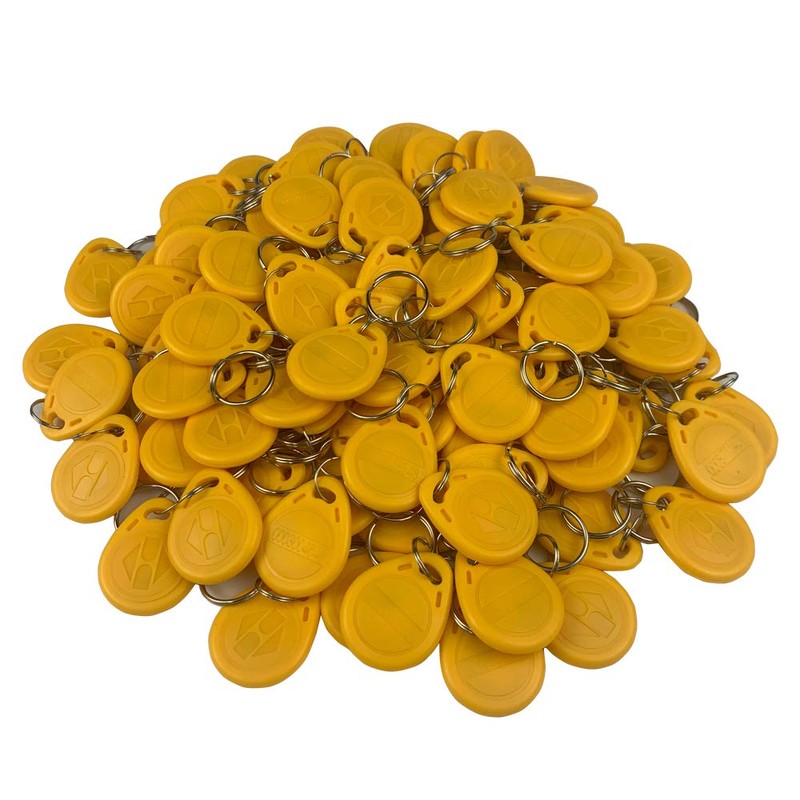 - Package including 100pcs Yellow keyfobs. Suitable for door access control system, video intercom system. apartment, office, park, etc.