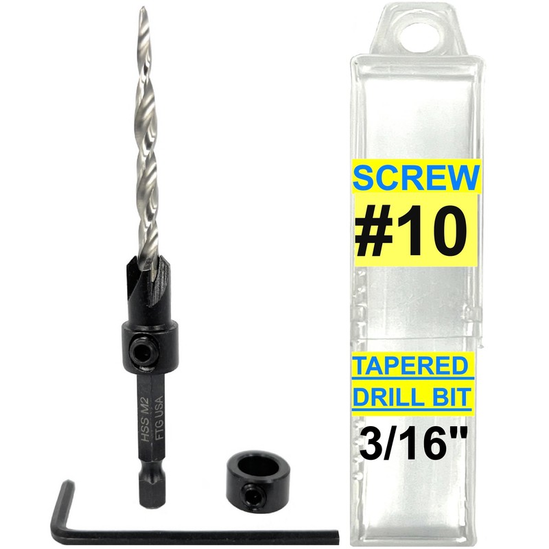 - Plastic Storage Container, Extendable Tube with #10 (3/16") Adjustable Wood Countersink, 1 Hex Wrench, and 1 Depth Stop Collar 3/8". Replacement tapered drill bits 3/16" are available in FTG USA store. Quality built counter bore attaches to flats on shank with 2 hex screws for a secure fit and can be adjusted for controlled pilot hole depth. Logo brand and drill bit size are laser printed on each countersink shank