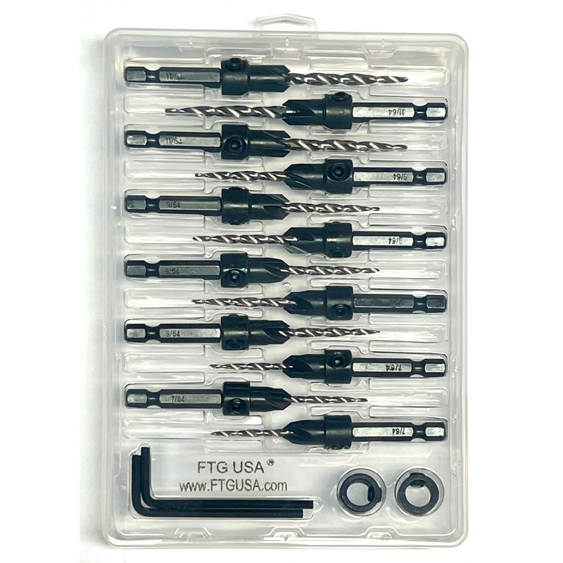 • Cabinet Installer Drill Set: Improved Connection Drill Bit to Hex Shank without Pin. Plastic Case Holder for Storage with 12 Pc Assortment, 3 Pc #4 (7/64"), 6 Pc #6 (9/64"), 3 Pc #8 (11/64") adjustable wood countersink, 2 Hex Wrench, and 2 Depth Stop Collars 3/8". FTG 4X468V2 countersink drill bits with tapered drill bit, 4 Flute countersink cutter #45 Carbon Steel, designed as tapered countersink set. Counter-bore and plugs have same size 3/8 inch