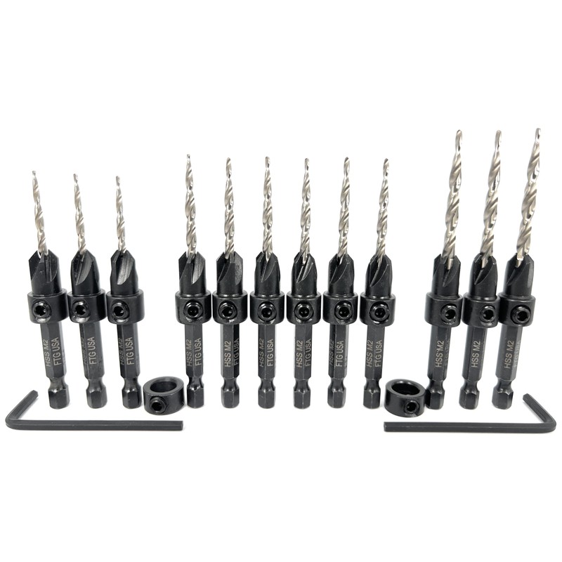 Version 2.0 FTG Maximum Torque countersink drill bits having superior connection drill-hex shank without a pin. 12 Piece Assortment, 3 Pc #4 (7/64"), 6 Pc #6 (9/64"), 3 Pc #8 (11/64") adjustable wood countersink, 2 Hex Wrench, and 2 Depth Stop Collars 3/8". One Dozen Counter Sinker drill bit set with 2 Hex Wrench and 2 Adjustable Depth Stop Collar. Adjustable Wood Countersink Set feature the best tapered drill bits 3rd Party Tested HSS M2, by far the most popular High-Speed Steel, Grade 6542, confirmed in Certificate of Analysis Report, has superior properties, including high toughness, wear resistance, and good cutting retention. Logo brand is laser printed on each countersink shank making it easier to differentiate this quality brand from others. Counterbore size 3/8", Plug size 3/8". Super sharp, exceptionally durable, easy to use, and built to perform well in both hard and soft woods. Drill, countersink and counterbore in 1 step. Top quality material #45 Carbon Steel adjustable four-cutter counter bore chamfer angle 82-degree, attachment that cuts fast and clears chips quickly for fast, smooth countersinking applications. The counter bore feature attaches flats on shank with 2 hex screws for a secure fit and can be adjusted for controlled pilot hole depth providing a clean finish for more polished final products. This product is designed, assembled and packaged in Bloomfield, New Jersey by Fair Trade Group USA LLC and professionally manufactured in China at FTG USA specifications. Packaging set combination/design protected by US Copyright Office.