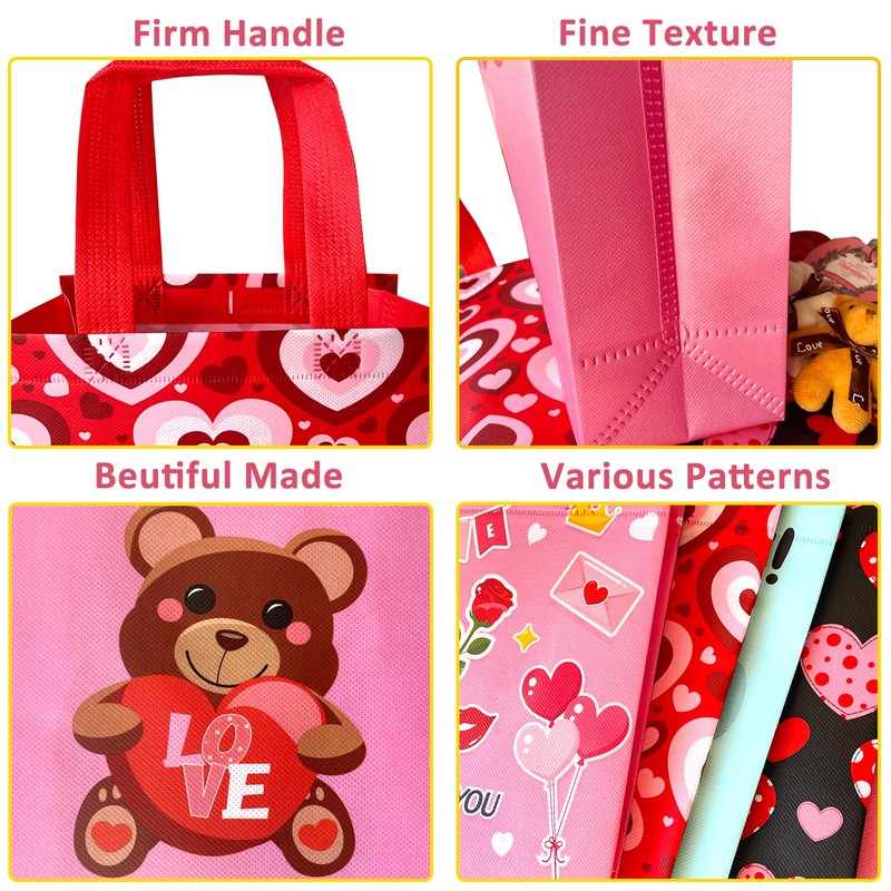 - ?? Reusable and Waterproof: These Valentines Day reusable treat bags with handles are made of quality non woven with waterproof coating, lightweight and reliable, designed with a sturdy handle for easy carrying of gifts and essentials, and the carrying capacity is larger than paper gift bags, can be applied many times.