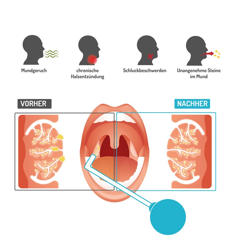 - FRISCHER ATEM: Aufgrund von Mandelsteinen entsteht oft ein schwefliger, übelriechender Geruch der Atem verschlechtert sich. Mit dem FUCHSI Mandelsteinsauger werden die übelriechenden Mandelsteine entfernt, wodurch Sie einen frischeren Atem haben.