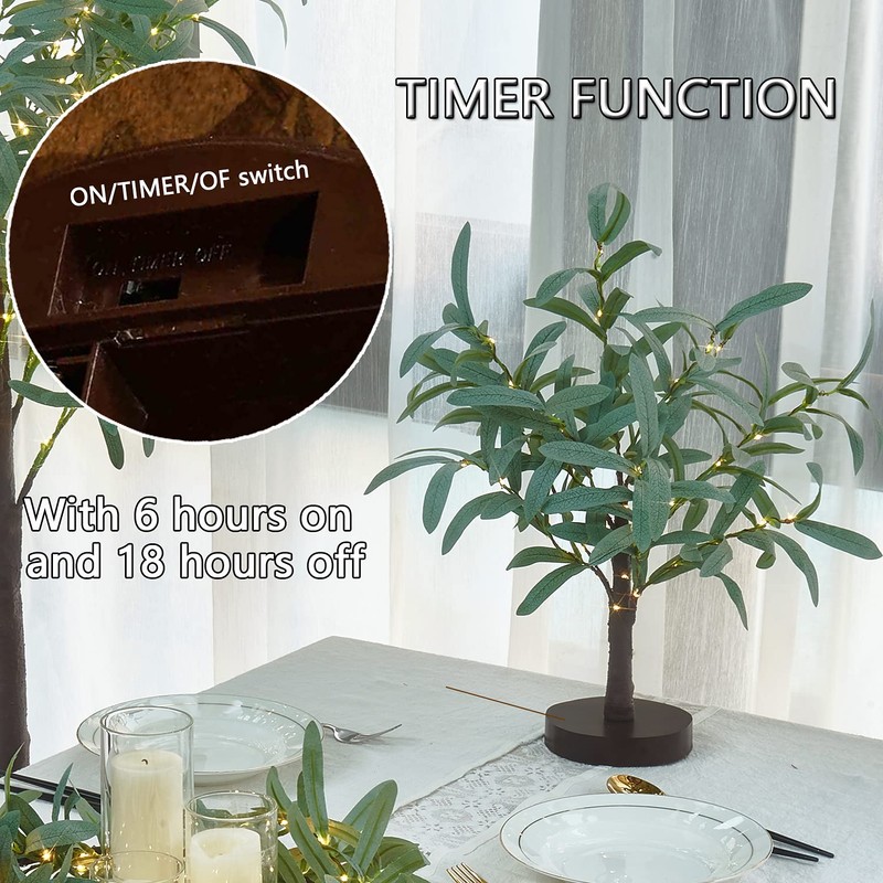 - đăAdded timing functionăWith a built-in auto-timer, this table top olive tree lights up at the same time every day, runs for 6 hours and then turns off automatically for 18 hours.No need to remember to turn it on every night.