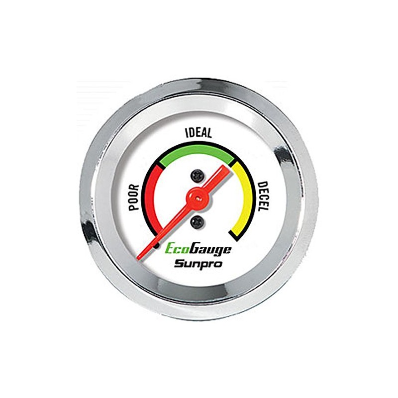 The new Sunpro EcoGauge is designed to help drivers visually monitor their driving habits and the impact they have on fuel economy. Its easy-to-read dial quickly indicates IDEAL to POOR fuel economy. The driver adjusts acceleration to gain maximum fuel economy. EcoGauge works with all types of light vehicles including; cars, trucks, crossovers, vans, and SUVs. \- 2" white face dial - 270° dial sweep - Includes 72" tubing and fittings - Features chrome bezel with removable chrome panel - Includes gauge and mounting hardware - Includes 12 Volt internal lighting - Designed for 12 Volt positive or negative ground systems (12 Volts required for dial illumination only) - Includes manuals