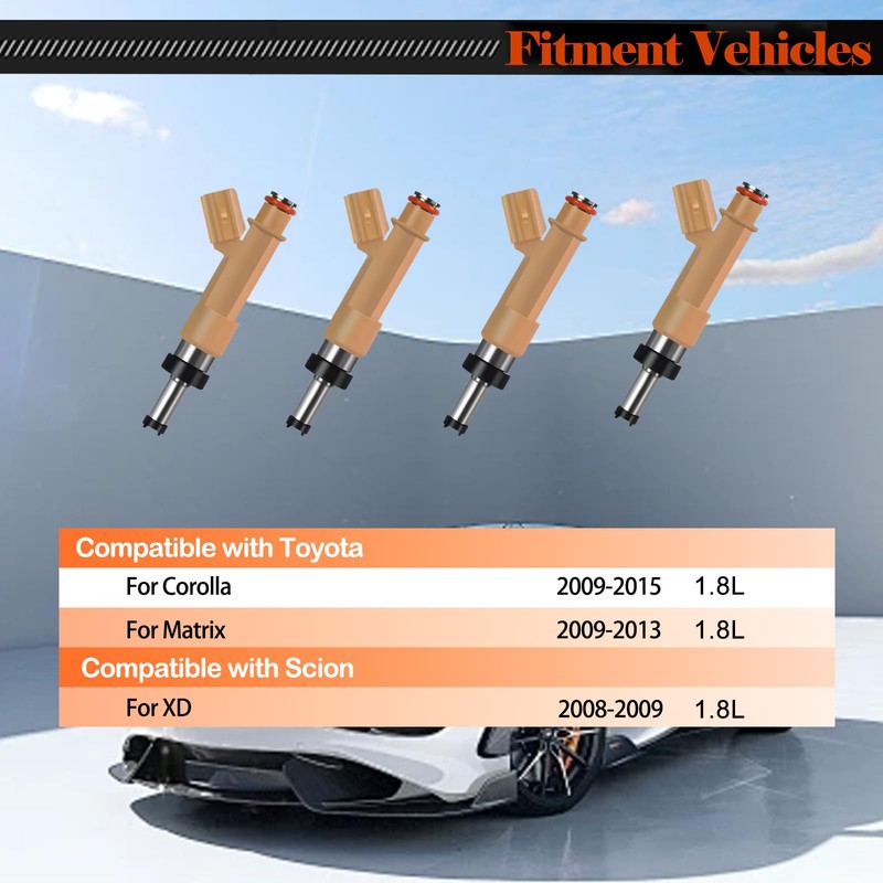 - Fitment Car:Set of 4 fuel injector compatible with Toyota Corolla 2009 2010 2011 2012 2013 2014 2015 1.8L,for Matrix 2009 2010 2011 2012 2013 1.8L, for Scion xD 2008 2009 1.8L