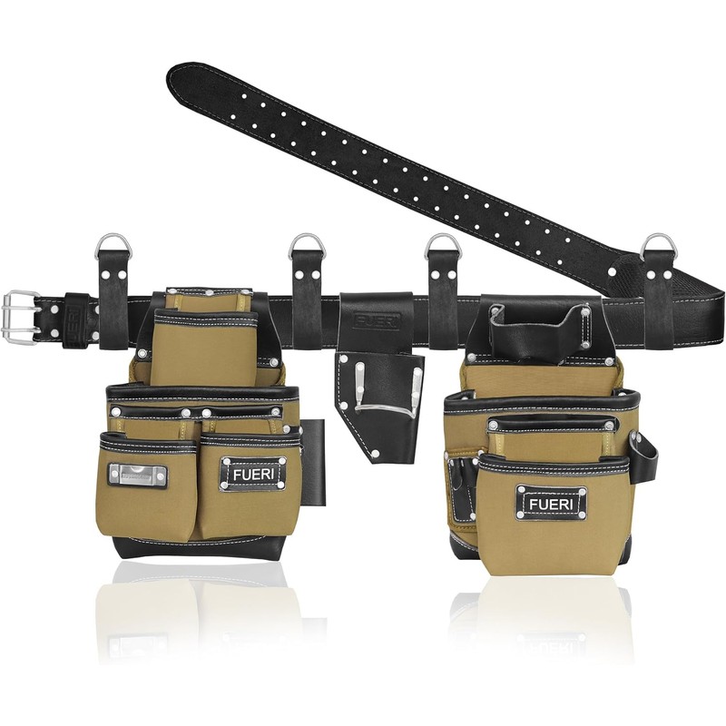 - TOOL BELT: The FUERI tool belt combines heavy-duty grain leather and double-layered nylon, making it perfect for tough jobs. This framing belt is built with 19 pockets, including 2 pouches, suspender loops, and a padded tool belt all designed to keep your tools secure and organized during long workdays. This electrician tool pouch belt adjusts from 30” to 52” waist sizes, with extra strength from double stitching and rivet reinforcements.
