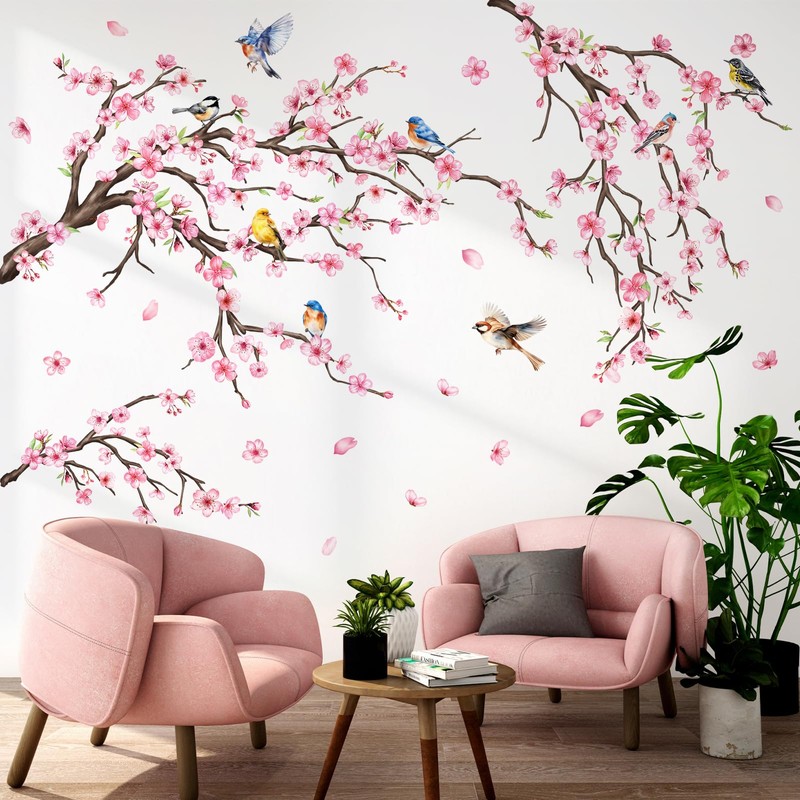 - Special Design: This spring wall sticker designed with blooming pink cherry branch, embellished with flying petals and birds, showing the vibrant scene of spring, adding a touch of spring to your walls.