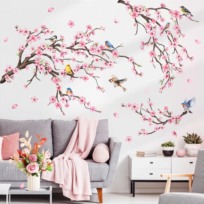 Beautiful design: Themed with pink cherry blossom flowers, branch and birds, beautiful and romantic wall decorations.
