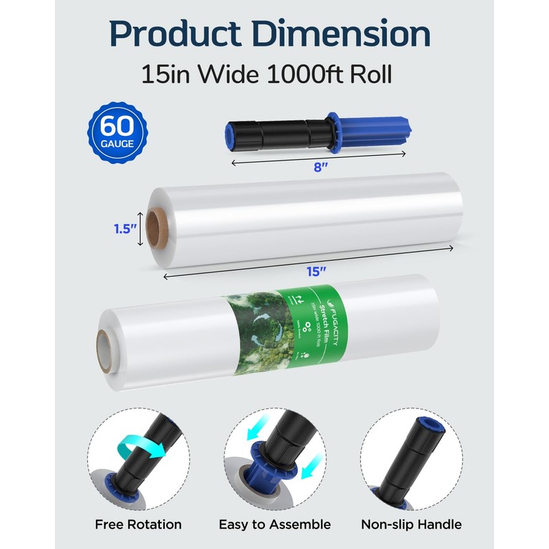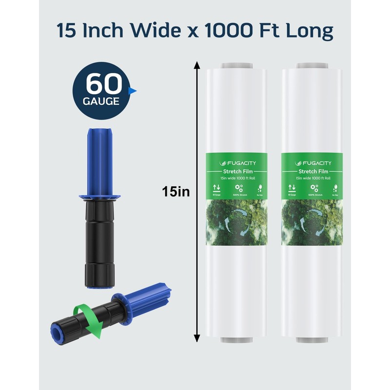 FugaCity Stretch Wrap Film-2 Pack 15 inch Wide 1000ft Heavy Duty Shrink Wrap,60 Gauge 500% Stretch Industrial Strength for Pallet Wrap, Furniture Wrapping Moving & Protection,2 Roll with Handles