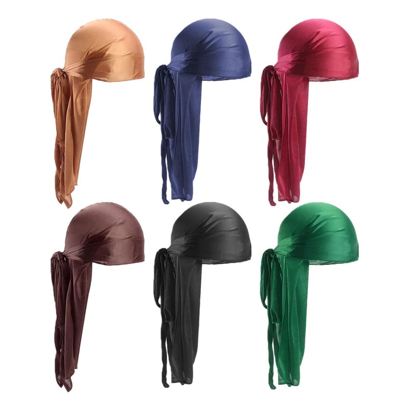 FUGLUS Men's 6 Pieces Silk Wave Cap with Long Tail Elastic Durags Soft Breathable Silky Wavy Perfect
