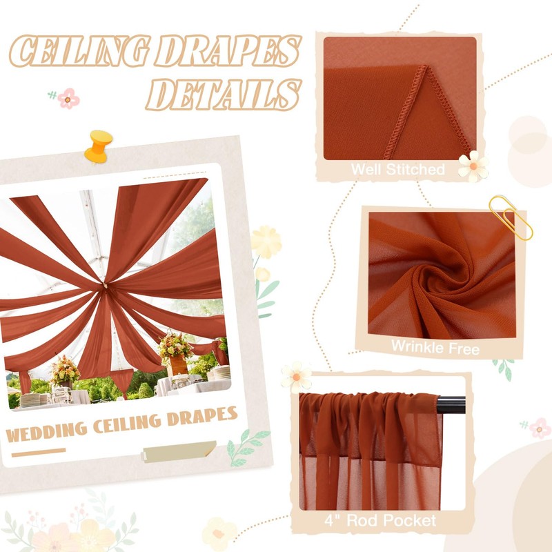 - ✿【Size of Ceiling Drapes】Package includes 4 panels terracotta wedding ceiling drapes. Size of each panel is 5FT( 60 inches) width by 20FT( 240 inches) length. This ceiling drapes for weddings can help your party to create a warm and elegant scenes.