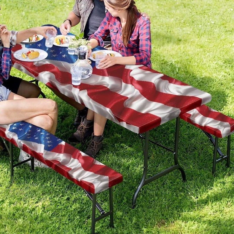FUIALDOLG American Flag Art Fitted Picnic Table Cover with Bench Covers Picnic Table and Chair Set Cover Oilproof Lightweight Easy to Fitted for Indoor Outdoor Patio Patriotic Cover
