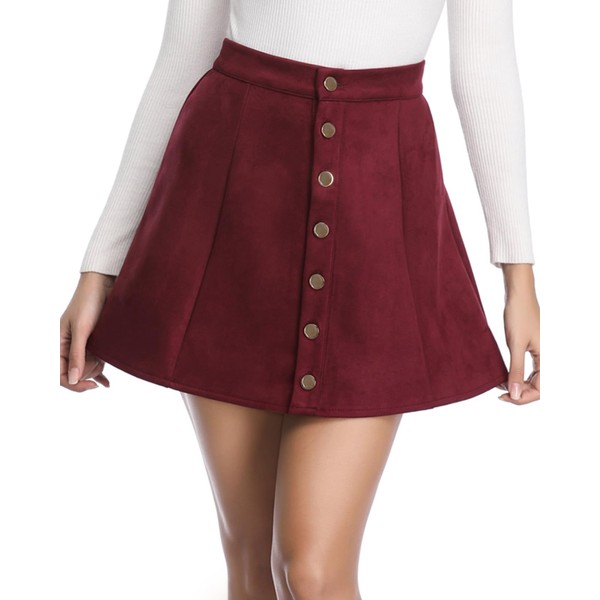 Fuinloth Women's Faux Suede Skirt Button Closure A-Line High Wasit Mini Short Skirt 2023 Wine Medium (US 8-10)
