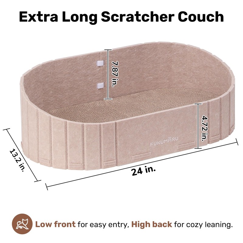 • Semi-Enclosed Design: Cat scratcher couch features a semi-enclosed oval design that is lower at the front and higher at the back, which makes it easy for cats to walk in and out. Lying down with their heads resting on the edge of the scratching bed, cats feel very comfortable for lounging or sleeping. Measuring 24 inches long and up to 7.87 inches in the back, large enough for cats to sleep on!