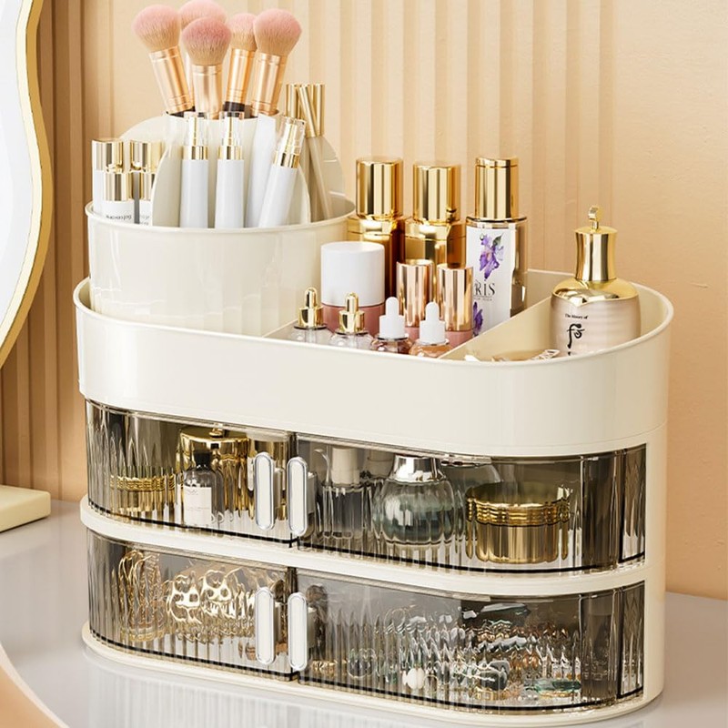 FUKWUNTO Cosmetic storage box with Brush Case Dustproof Desk Make Up Organizer for lipstick eye shadow Stationery storage (Cream)
