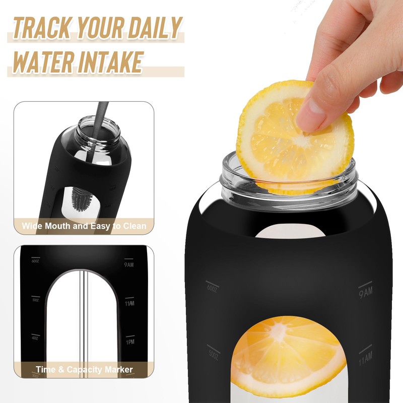 - OUR ASSURANCE: We're certain you'll love our clear glass water bottle with time marker for its quality and functionality. It is a perfect gift for gym enthusiasts and sports lovers, ideal for both indoor and outdoor activities. So, what are you waiting for? Get your 64 Ounce Time Marked Aesthetic Water Bottle today!