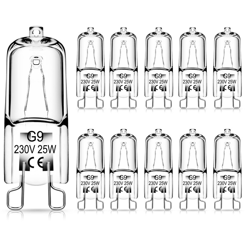 - High Quality. 10 Pcs G9 halogen bulbs, with 25w clear glass. Flicker free, and no hum quite operation. No lead or mercury, no UV or IR radiation, great for the environment.