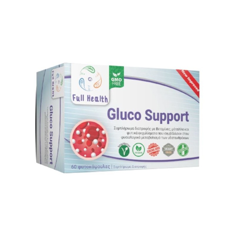 Full Health Gluco Support is a nutritional supplement with vitamins, minerals and plant extracts that contribute to healthy carbohydrate metabolism.
