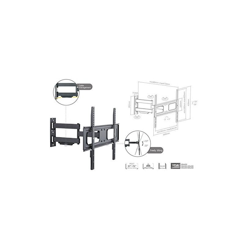 Specifically designed for 37"-70" TVs, articulates in different directions to ensure the best view at any angle.With its low profile, it sits only 2.3 inches from the wall. When the mount is fully extended, it reaches 18.6” from the wall. The mount can tilt 20º degrees downward, 10° upward tilt. The mount can be swiveled 180° left and right. The mounting plate adjusts 3° in each direction for tight corner spaces as well. With all the mounting positions available, you are sure to find the position that works for you! The wall mount is compatible with most TVs in the 37" to 70" range with a maximum recommended weight capacity of 110 lbs or 50kg and VESA mounting patterns of 200x200, 400x200, 300x300, 400x400, 600x400 mm. Please check your TV's VESA mounting pattern before ordering. Included with the mount is all necessary mounting hardware. Customize your screen angle for the best view wherever you are!