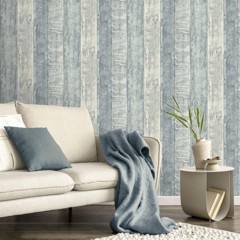 - Rustic Distressed Wood Plank Design – This authentic wallpaper design flawlessly replicates the charming appearance of weathered wooden planks, presented in a captivating palette of cool blues, greys, and light, bleached tones. Each plank features realistic grain, subtle knots, and a beautifully distressed effect, creating a unique and inviting atmosphere that brings the natural allure of aged timber into your home without traditional installation.