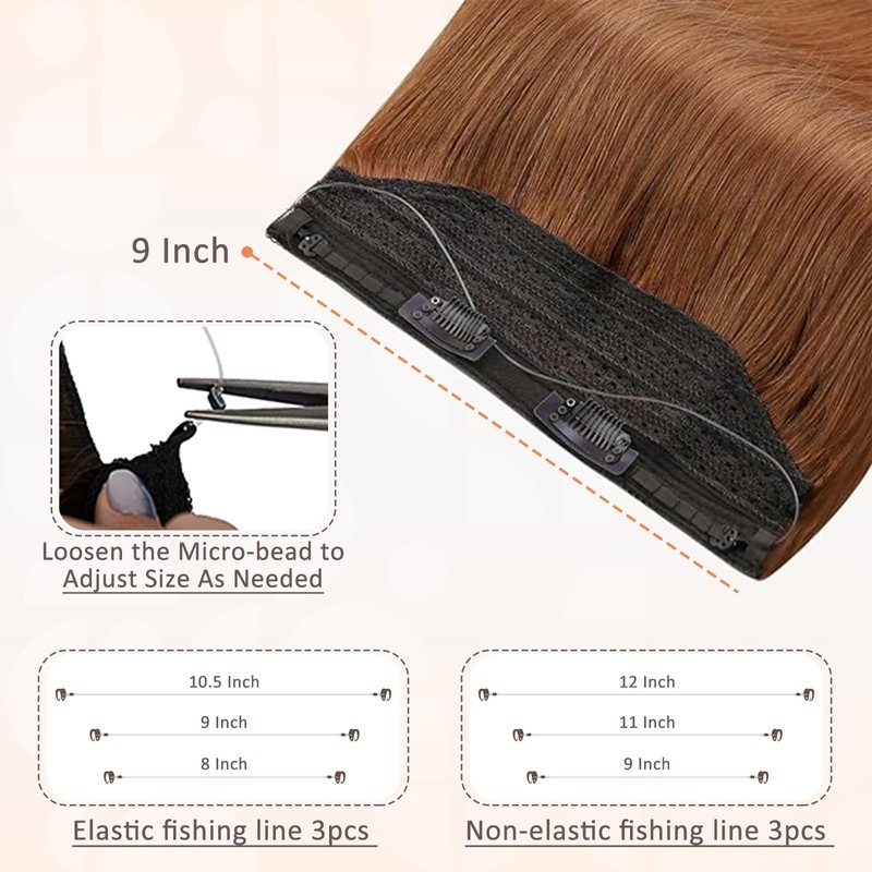 1.Put The Fishing Wire Hair Extension On The Head And Pull The Wire To Tighten For A Perfect Fit. Knot The Loop To Secure Extension In Place.