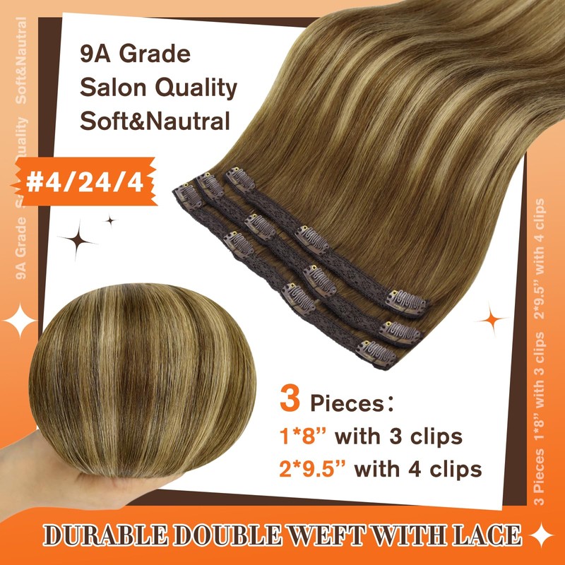 Full Shine Balayage Hair Extensions for Women Lace Weft Clip in Hair Extensions Color 4/24/4 Human Hair Clip in Human Hair Extensions 3 Pieces 20 Inch Hair Extensions 60 Grams