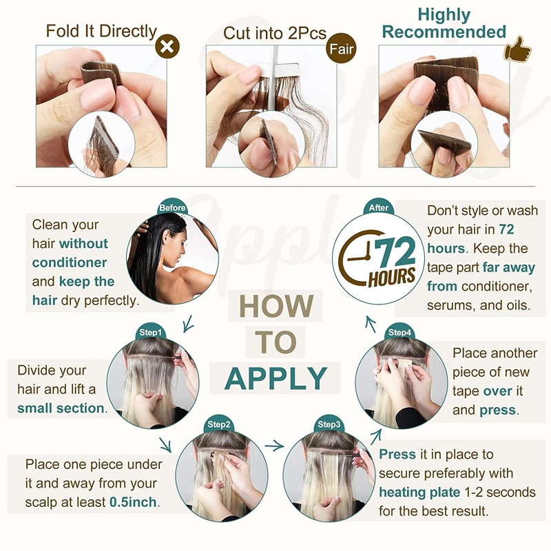 - [Applying Method] The Professional Install Method of Hair Extensions Tape in Human Hair is the Way of “Sandwich”. Also Heat the Tape for Seconds Around 151 Celsius Before Applying. These Tape in Hair Extensions Will Stay Firmly and Won't Fall Off Easily.
