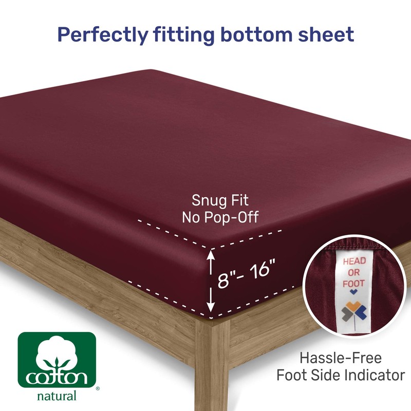 • PREMIUM BURGUNDY RED FULL SIZE FITTED SHEET (SINGLE PIECE) - Sleep comfortably with our all-around elasticized fitted sheet: 54" W x 75" L + 16" deep pocket fits low profile foam and tall mattresses. The full deep pocket bottom sheet features a smart head/foot tag to indicate the width side of the fitted sheet for ease of use. The fitted cotton sheets are easy to care for, machine washable, fade-resistant and fit flawlessly. Regular wash & short dry cycles recommended for superior softness