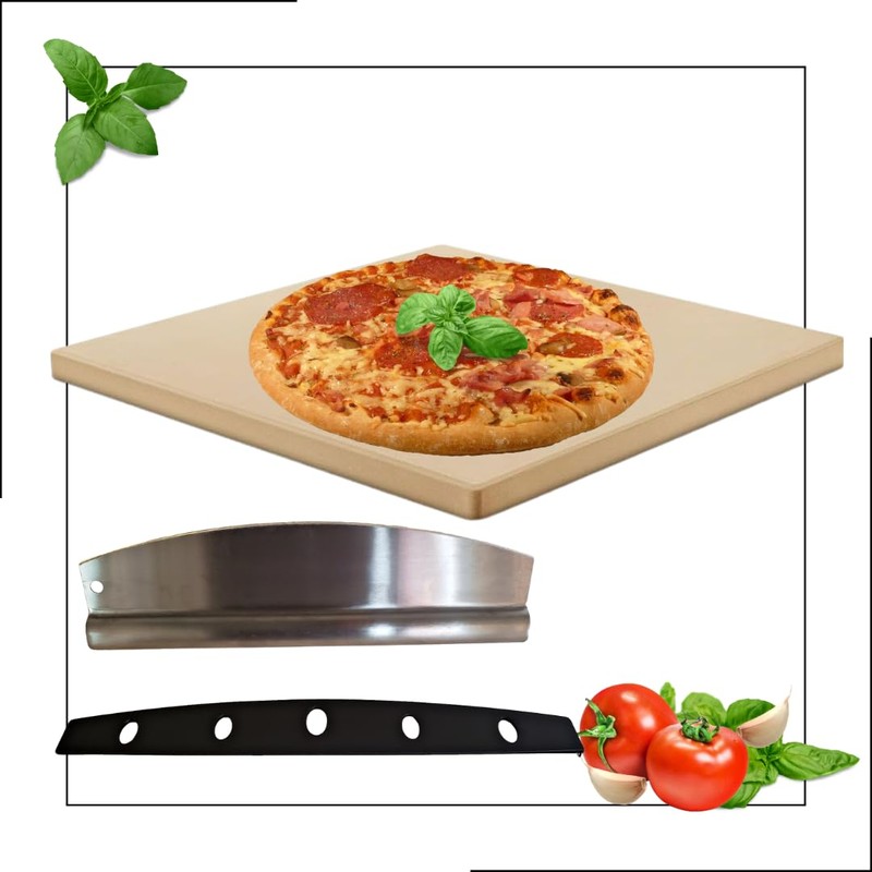 - [SQUARE PIZZA STONE + ROCKER CUTTER COMBO: ] ►►Elevate your pizza games with our full size pizza stone! This rectangular baking stone ensures even heat distribution making every slice crispy and delicious. Perfect use for pizzas, pastries, baked goods and so much more! ►►This rocker-style, stainless steel pizza cutter makes diividing a breeze! Cuts through with ease and the over-all stainless steel design makes this unit dishwasher safe - unlike similar wooden handle styles.