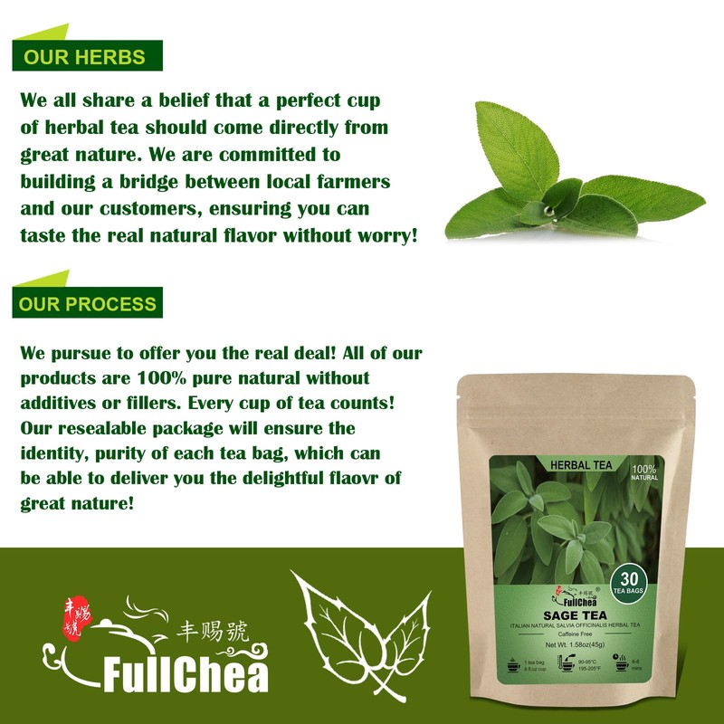 FullChea - Sage Tea Bags - 30 Count X 1.5g - Premium Natural Cut & Sifted Sage Leaf - Non-GMO - Caffeine-free