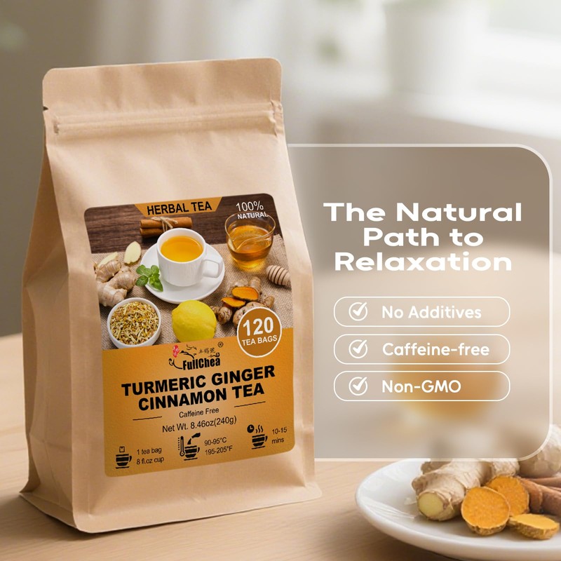 FullChea - Turmeric Ginger Cinnamon Tea Bags, 120 Teabags, 2g/bag - Premium Turmeric, Ginger, Cinnamon - Non-GMO - Caffeine-free - Aid Digestion & Boost Immunity