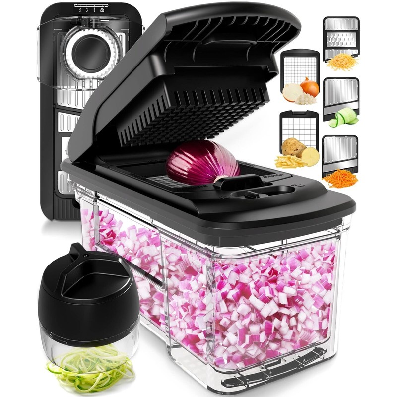 - Greatest functionality on the market - 5 interchangeable blades means this cook's tool & gadget set meets all of your slicing, grating and chopping needs. Choose the perfect thickness of your sliced vegetables with the easy-to-use adjuster dial and select the ideal size for your chopped vegetables by simply changing the inserts.